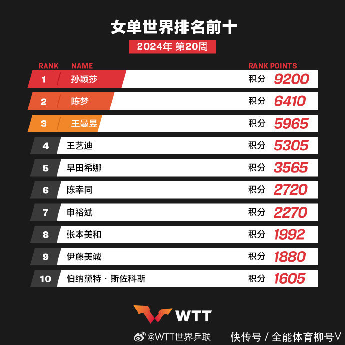 WTT沙特大满贯之前,王曼昱排活着界第二,陈梦排活着界第四。凭借WTT沙特大满贯夺得女单冠军的霸气施展,新2代理开户陈梦卓绝王曼昱飞腾到第二,王曼昱则下滑到第三,同期失去奥运女单参赛资历。