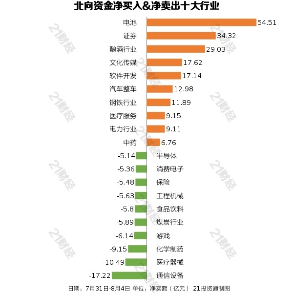 从净买入金额来看,北向资金增捏了46个行业,其中电板居首,净买入金额达54.51亿元,其次是证券行业,净买入34.32亿元。