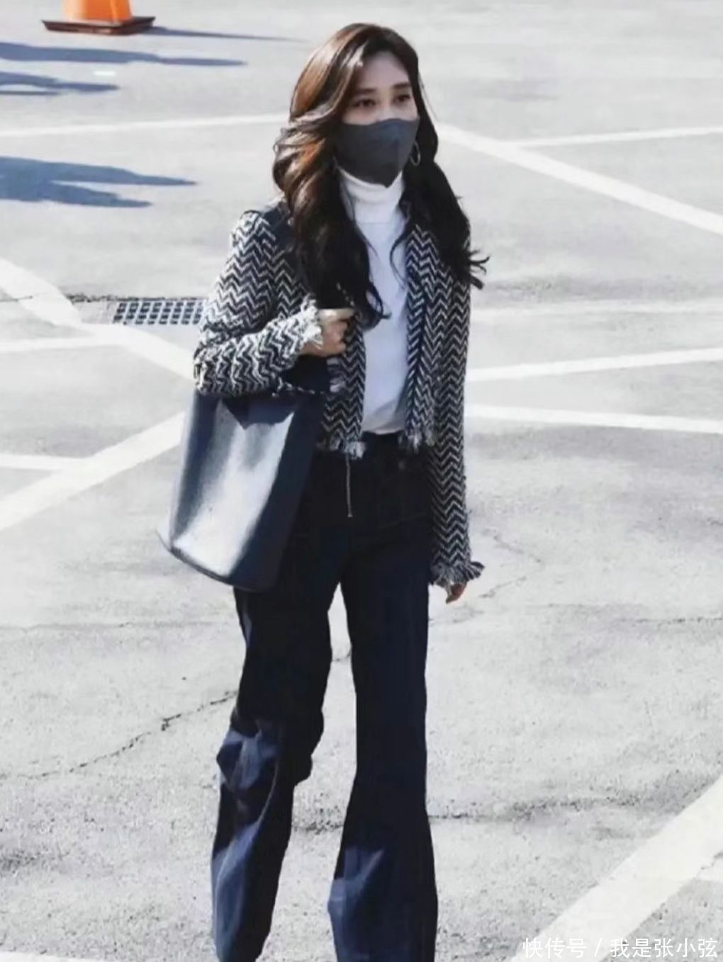 思要穿出好体魄的话,就不要老是遴荐松垮无形的衣服了,带点修身时势的上衣,卤莽勾画出腰部纤细的线条。上窄下宽的微喇裤,便不错很好的优化腿型线条,既能遮住腿粗的问题,又不错穿出大长腿的成果。